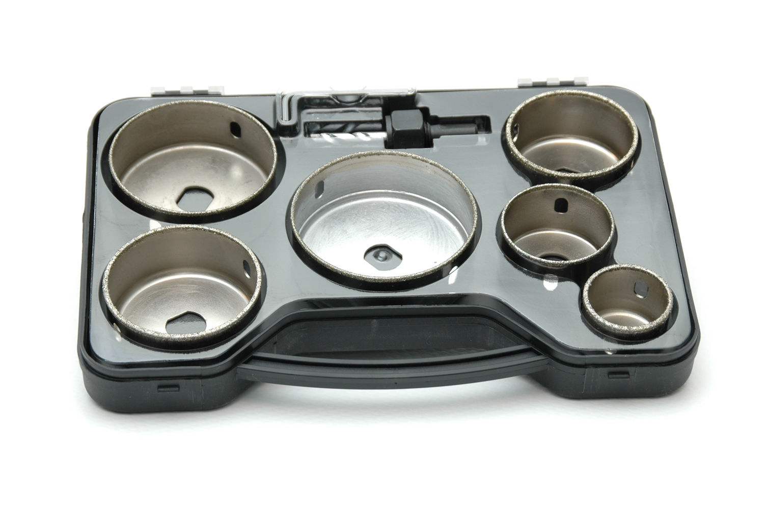 Settet inneholder bor i dimensjoner 38,50,60,67,75 og 83mm og drillfeste, senterspiss og nøkkel.