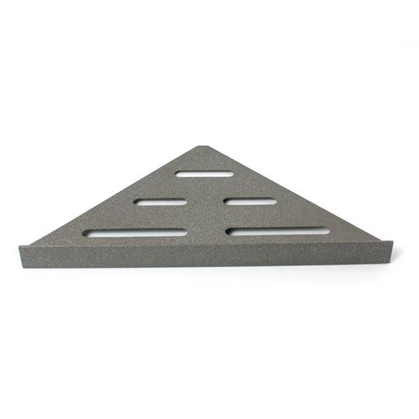 Elegant dusjhylle for montering med keramiske fliser i hyllen. Hyllen festes i fugen med silikon. Passer i 90° hjørner. Laget i pulverlakkert rustfritt stål type AISI 304 med Stone finish i mørk granitt farge. Materialtykkelse: 1,2 mm. Ikke syrebestandig. Mål: 292 x 156 x 23 mm Akkurat som naturstein har detaljene i Tebo Details STONE-serien en matt strukturert overflate med liv og forskyvninger, som gjør at de naturlig går i ett med andre overflater og materialer.