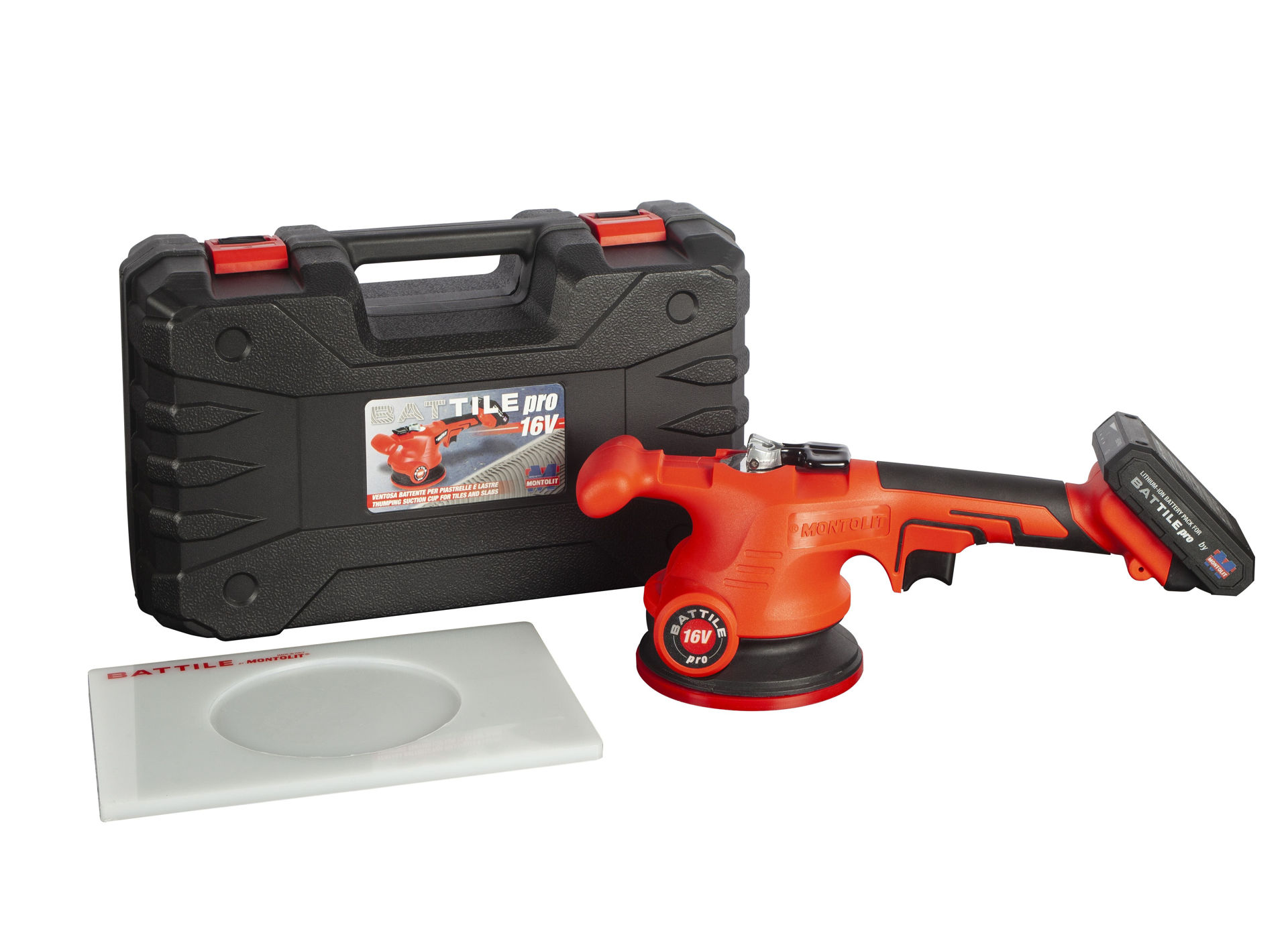Sugekoppen, som aktiveres enkelt med en eksentrisk spak, tillater løfting av opptil 25 kg og kan holdes under vakuum for å vibrere flisen etter at den er lagt. For å utføre vibrasjonsoperasjonen anbefales det å frigjøre sugekoppen og bruke en sirkulær bevegelse fra innsiden av flisen og utover, spesielt ved store formater eller tynne plater.